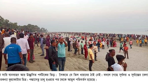 পর্যটন মো.আনিচুর রহমান জানান, পদ্মা সেতুর কারনে এখন পর্যটকদের আগমন বেড়েছে। মাত্র সাড়ে ৫ ঘান্টায় কুয়াকাটায় এসে পৌঁছেছি। বিভিন্ন পর্যটন স্পট ঘুরে পরিবারের সদস্যরা অনেক আনন্দ করেছে। অপর এক পর্যটক হাফিজুর রহমান বলেন, একসঙ্গে এতো বেশি মানুষ আর কখনো দেখিনি। বন্ধুরা সবাই মিলে সমুদ্রে সাঁতার কেটেছি। এ এক দারুণ উপলব্ধি। বেশ ভালো লাগছে। তবে নির্দিষ্ট কোনো বাসস্ট্যান্ড না থাকায় সড়কের পাশে রাখা গাড়িগুলোর করানে হাটা চলায় অনেকেরই বিঘœ হয়েছে।