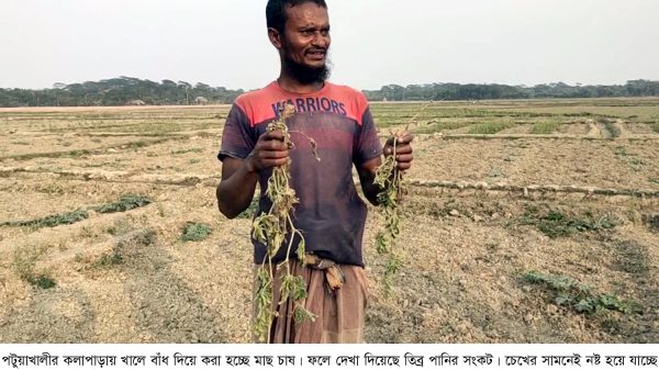 পটুয়াখালীর কলাপাড়ায় খালে বাঁধ দিয়ে করা হচ্ছে মাছ চাষ। ফলে দেখা দিয়েছে তিব্র পানির সংকট। চেখের সামনেই নষ্ট হয়ে যাচ্ছে কৃষকের স্বপ্ন। পানির অভাবে দিশেহারা হয়ে পড়েছে তরমুজ চাষীরা। এমন অবস্থার সৃষ্টি হয়েছে উপজেলার বালিয়াতলী ইউনিয়নের বড় বালিয়াতলী গ্রামে। কৃষক হাাবিবুল্লাহ প্যাদা প্রায় ৪০ একর জমিতে তরমুজ চাষ করছেন। তিন বলেন পানির অভাবে জমি সেচ দিতে না পারায় তরমুজের লতা ক্রমশই শুকিয়ে যাওয়ার উপক্রম হয়েছে। একই কথা বলেছেন কৃষক আনোয়ার,জলিল মাতুব্বর,খলিল হাওলাদারসহ আরো অনেকে।