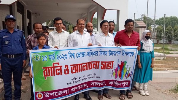 ‘নিরাপদ জ্বালানি, ভোক্তাবান্ধব পৃথিবী’ এই প্রতিপাদ্য বিষয়কে সামনে রেখে ফরিদপুরের সালথায় বিশ্ব ভোক্তা অধিকার দিবস ২০২৩ইং উদযাপন উপলক্ষে র্যালি ও আলোচনা সভা অনুষ্ঠিত হয়েছে। বুধবার (১৫ মার্চ) বেলা ১১টায় উপজেলা প্রশাসনের আয়োজনে উপজেলা পরিষদের সম্মেলন কক্ষে আলোচনা সভা অনুষ্ঠিত হয়। দিবসটির শুরুতে উপজেলা পরিষদের চত্বর থেকে একটি র্যালি বের হয়ে সালথা সদর বাজারসহ প্রধান প্রধান সড়ক প্রদক্ষিণ করে সূচনা স্থানে এসে শেষ হয়।