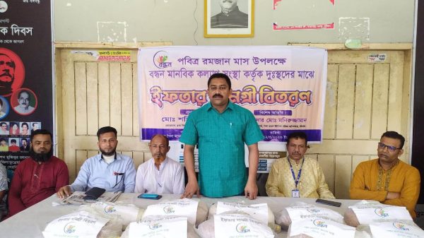আসন্ন পবিত্র রমজান উপলক্ষে বরিশালের আগৈলঝাড়ায় স্বেচ্ছাসেবী সংগঠন ‘বন্ধন মানবিক কল্যান সংস্থা’’ কর্তৃক শতাধিক দুঃস্থ পরিবারের মাঝে ইফতার সামগ্রী বিতরণ করা হয়েছে। ২২মার্চ বুধবার সকাল ১১ঘটিকায় গৈলা মডেল ইউনিয়ন পরিষদ চত্তরে আয়োজিত অনুষ্ঠানে গৈলা মডেল ইউনিয়ন চেয়ারম্যান মোঃ শফিকুল হোসেন টিটু তালুকদার প্রধান অতিথি হিসেবে ১শ দুঃস্থ পরিবারের মাঝে বুট, চিনি, তেল, খেজুর, চিড়াসহ ইফতার সামগ্রী বিতরণ করেন।