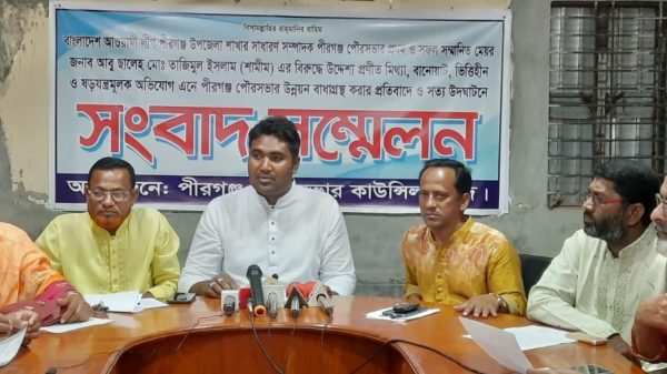 এতে ৫ কাউন্সিলর উপস্থিত থেকে লিখিত বক্তব্য দেন। বক্তব্যে কাউন্সিলররা উল্লেখ করেন-আওয়ামীলীগ পীরগঞ্জ উপজেলা শাখার সাধারন সম্পাদক তাজিমুল ইসলাম শামীম একজন সৎ,নিষ্ঠবান ও গ্রহনযোগ্য ব্যক্তি। মুলত একটি মহল পীরগঞ্জ পৌরসভার অগ্রযাত্রাকে বাধাগ্রস্থ এবং ভাবমূর্তী বিনষ্টের হীন উদ্দেশ্যে ওই অপপ্রচার চালাচ্ছে।