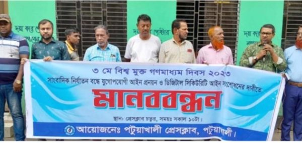 বিশ্ব মুক্ত গণমাধ্যম দিবস পালন উপলক্ষে পটুয়াখালীতে সাংবাদিকদের মানববন্ধন অনুষ্ঠিত হয়েছে। বুধবার সকাল ১০টায় পটুয়াখালী প্রেসক্লাবের সামনে প্রেসক্লাবের ভারপ্রাপ্ত সভাপতি অ্যাডভোকেট সোহরাব হোসেনের সভাপতিত্বে ও সাধারন সম্পাদক জাকারিয়া হৃদয়ের সঞ্চালনায় বক্তব্য রাখেন পটুয়াখালী প্রেসক্লাবের সাবেক সভাপতি ও ইত্তেফাক জেলা প্রতিনিধি বীর মুক্তিযোদ্ধা নির্মল কুমার রক্ষিত, সাবেক সাধারন সম্পাদক ও মানবজমিন জেলা প্রতিনিধি জালাল আহম্মেদ, সাবেক ট্রেজারার ও প্রথম আলো জেলা প্রতিনিধি শংকর লাল দাসসহ অন্যান্যরা।