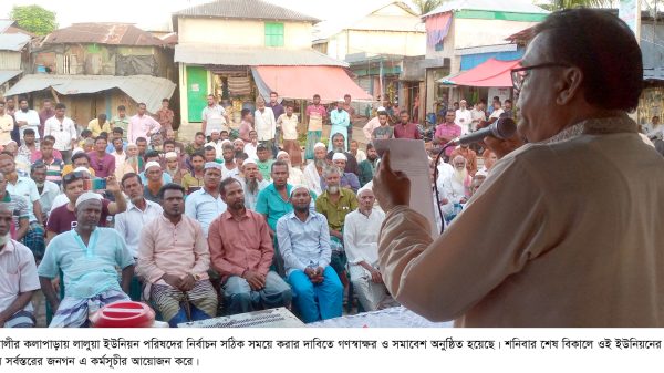 কলাপাড়া(পটুয়াখালী)প্রতিনিধি,২২ জুলাই।। পটুয়াখালীর কলাপাড়ায় লালুয়া ইউনিয়ন পরিষদের নির্বাচন সঠিক সময়ে করার দাবিতে গণস্বাক্ষর ও সমাবেশ অনুষ্ঠিত হয়েছে। শনিবার শেষ বিকালে ওই ইউনিয়নের বানাতি বাজারে সর্বস্তরের জনগন এ কর্মসূচীর আয়োজন করে। এতে সভাপতিত্ব করেন ইউনিয়ন আওয়ামীলীগ সভাপতি মো.তারেকুল ইসলাম তারেক খান। সমাবেশে বক্তব্য রাখেন, সাবেক ইউনিয়ন পরিষদ চেয়ারম্যান মীর তারেকুজ্জান তারা, ইউনিয়ন আওয়ামীলীগ সাধারন সম্পাদক মো.ফোরকান প্যাদা, স্থানীয় বাসিন্দা শফিকুল আলম শান্তি ফকির, আব্দুল হক মৃধা প্রমুখ।