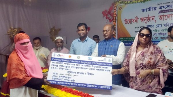 জাতীয় মৎস্য সপ্তাহ,২০২৩ উপলক্ষে পটুয়াখালীর কলাপাড়া উপজেলার মোম্বিপাড়া ও মুসুল্লিয়াবাদের ২’শ অসহায় জেলে পরিবারের মাঝে ৫ হাজার ৫’শ টাকা করে বিকাশের মাধ্যমে নগদ অনুদান প্রদান করা হয়েছে। এতে ওই পরিবারের সদস্যদের মুখে হাসি ফুটে উঠেছে। তারা প্রধানমন্ত্রি শেখ হাসিনার প্রতি কৃতজ্ঞতা জানান। সোমবার সকাল ১০ টায় কলাপাড়া উপজেলা পরিষদের হলরুমে জাতীয় মৎস্য সপ্তাহ উদ্বোধন ও আলোচনা অনুষ্ঠানে প্রধান অতিথি হিসেবে পটুয়াখালী-৪ আসনের সংসদ সদস্য মো. মহিববুর রহমান তাদের হাতে এ অনুদান তুলে দেন। অনুষ্ঠানে সভাপতিত্ব করেন কলাপাড়া উপজেলা নির্বাহী অফিসার মো. জাহাঙ্গীর হোসেন। স্বাগত বক্তব্য রাখেন উপজেলা সিনিয়র মৎস্য অফিসার অপু সাহা। বিশেষ অতিথি হিসেবে উপজেলা পরিষদের ভারপ্রাপ্ত চেয়ারম্যান শাহিনা পারভীন সীমা, কলাপাড়া মৎস্য গবেষণা ইনস্টিটিউটের সিনিয়র সাইন্টিফিক অফিসার মো. আশরাফুল হক, কলাপাড়া থানা অফিসার ইনচার্জ (ওসি) মো. আলী আহম্মেদ, কলাপাড়া প্রেসক্লাব সভাপতি মো. হুমায়ুন কবির, ওয়ার্ল্ড ফিশ (ইকো ফিশ-২) এর সহযোগী গবেষক সাগরিকা স্মৃতি, মহিপুর মৎস্য বন্দর সভাপতি দিদার উদ্দিন আহমেদ মাসুম বেপারী বক্তব্য রাখেন। এছাড়া নৌবাহিনী ও কোষ্ট গার্ড অফিসার, উপজেলা মৎস্য অফিসের কর্মকর্তা-কর্মচারী, বিভিন্ন ইউনিয়ন থেকে আগত জেলে ও মৎস্য ব্যবসায়ীরাসহ প্রিন্ট ও ইলেকট্রনিক্স মিডিয়ার গনমাধ্যম কর্মীরা উপস্থিত ছিলেন। আলোচনা অনুষ্ঠান শেষে ৫ জন সফল মৎস্য চাষীদের মাঝে ক্রেস্ট এবং ৩০ জন মাঝিদের মাঝে ১ টি করে ফাস্ট এইড বক্স ও লাইফ জ্যাকেট বিতরন করা হয়। পরে র্যালী ও পুকুরে পোনা অবমুক্ত করনের মাধ্যমে অনুষ্ঠানের সমাপ্তি করা হয়।