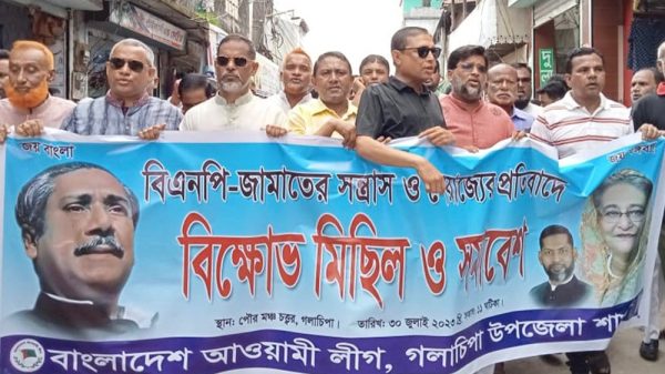 বিএনপি-জামাতের সন্ত্রাস ও নৈরাজ্যের প্রতিবাদে সারা দেশের ন্যায় পটুয়াখালীর গলাচিপায় আওয়ামী লীগের বিক্ষোভ মিছিল ও সমাবেশ অনুষ্ঠিত হয়েছে। রবিবার (৩০ জুলাই) বেলা ১১টায় উপজেলা আওয়ামী লীগের উদ্যোগে দলীয় কার্যালয়ের সামনে পৌরমঞ্চ চত্বরে এই সমাবেশ অনুষ্ঠিত হয়। উপজেলা আওয়ামী লীগের সহ-সভাপতি হাজী মু. মজিবর রহমানের সভাপতিত্বে উপস্থিত ছিলেন উপজেলা আওয়ামী লীগের সাধারণ সম্পাদক বীর মুক্তিযোদ্ধা গোলাম মোস্তফা টিটো, যুগ্ম সাধারণ সম্পাদক ও উপজেলা পরিষদ চেয়ারম্যান মু. শাহীন শাহ। আরও উপস্থিত ছিলেন সাবেক রাষ্ট্রপতির সামরিক সচিব ও বিজিবির মহাপরিচালক লেফটেন্যান্ট জেনারেল (অব.) আবুল হোসেন, জেলা পরিষদ সদস্য মাইনুল ইসলাম রনো, কেন্দ্রীয় যুবলীগের সহ-সম্পাদক মু. মামুন আজাদ, উপজেলা আওয়ামী লীগের সহ-সভাপতি মো. রেজাউল করিম হাওলাদার ও আজিজুর রহমান বাবলু ভূঁইয়া, যুগ্ম সাধারণ সম্পাদক সরদার মু. শাহ আলম ও মো. আলমগীর হোসেন, সাংগঠনিক সম্পাদক মোফাজ্জেল হোসেন মাসুদ, তথ্য ও গবেষণা বিষয়ক সম্পাদক আ স ম জাওয়াদ সুজন, উপজেলার সাবেক মুক্তিযোদ্ধা কমান্ডার বীর মুক্তিযোদ্ধা, মু. নুরুল ইসলাম ধলা, বীর মুক্তিযোদ্ধা শামসুদ্দিন শানু ঢালী, কেন্দ্রীয় কালিবাড়ী কমিটির সভাপতি দিলীপ বণিক, গলাচিপা প্রেস ক্লাবের সভাপতি সমিত কুমার দত্ত মলয়, ডাকুয়া ইউনিয়ন পরিষদ চেয়ারম্যান বিশ্বজিৎ রায়, চিকনিকান্দি ইউনিয়ন পরিষদ চেয়ারম্যান সাজ্জাদ হোসেন রিয়াদ, গোলখালী ইউনিয়ন পরিষদ চেয়ারম্যান মো. নাসিরউদ্দিন হাওলাদার প্রমুখ। এছাড়াও আওয়ামী লীগ, যুবলীগ, ছাত্রলীগ, কৃষকলীগ, শ্রমিক লীগ, স্বেচ্ছাসেবক লীগ, মৎস্যজীবী লীগ এবং সহযোগী ও অঙ্গসংগঠনের নেতাকর্মীরা সমাবেশে উপস্থিত ছিলেন। সমাবেশ শেষে একটি বিক্ষোভ মিছিল বের করা হয়। বিক্ষোভ মিছিলটি শহরের প্রধান প্রধান সড়ক প্রদক্ষিণ করে একই স্থানে এসে শেষ হয়।