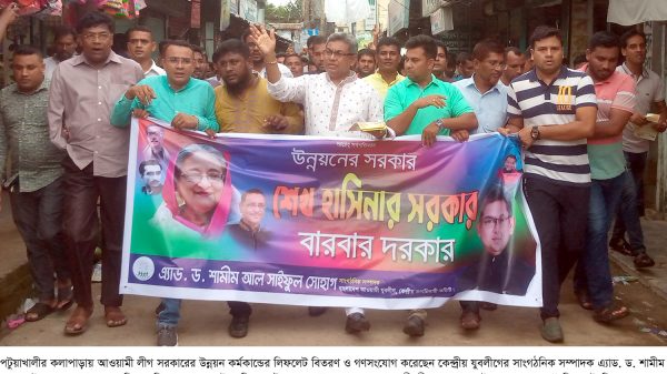 কলাপাড়ায় সরকারের উন্নয়ন কর্মকান্ডের লিফলেট বিতরণ ও গণসংযোগ করেন কেন্দ্রীয় যুবলীগ নেতা