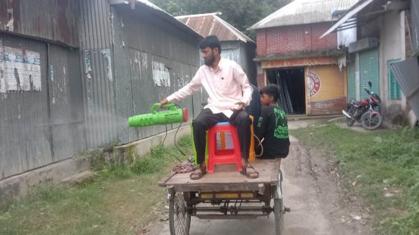 সালথায়  কীটনাশক ব্যবসায়ী সাহাদাৎ হোসেনের ব্যতিক্রমী উদ্যোগ, মশা নিধনে স্প্রে