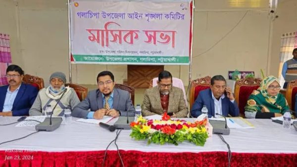 গলাচিপায় উপজেলা প্রশাসন কতৃক আয়োজিত মাসিক আইনশৃঙ্খলা কমিটির মাসিক সভা অনুষ্ঠিত হয়। এসময় উপজেলা নির্বাহী অফিসার মোঃ মহিউদ্দিন আল হেলাল এর সভাপতিত্বে প্রধান অতিথি হিসেবে উপস্থিত ছিলেন ১১৩ পটুয়াখালী-৩ আসনের জাতীয় সংসদ সদস্য এস এম শাহজাদা। বিশেষ অতিথি ছিলেন উপজেলা পরিষদ চেয়ারম্যান মু.সাহিন শাহ,উপজেলা কৃষি অফিসার আরজু আক্তার, উপজেলা স্বাস্থ্য ও পরিবার পরিকল্পনা কর্মকর্তা ডাঃ মোঃ মেজবাহ উদ্দিন, সিনিয়র মৎস্য অফিসার মোঃ জহিরুন্নবী। এছাড়াও আরো উপস্থিত থাকেন উপজেলা সকল দপ্তরের প্রধান গন ও ইউনিয়ন, পৌরসভা জনপ্রতিনিধি গন এবং আইনশৃঙ্খলা কমিটির সদস্যরা।এসময় বাজারে উর্ধগতি, মাদক নির্মুল,সহ বিভিন্ন বিষয়ের উপরে বক্তব্য রাখেন।