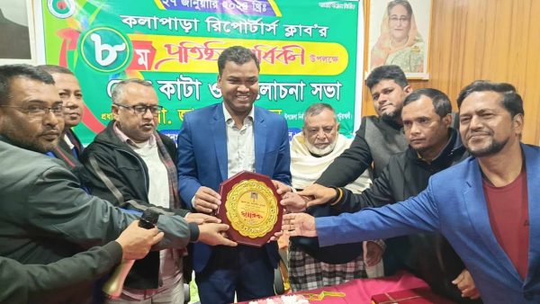 জমকালো আয়োজনের মাধ্যমে পটুয়াখালীর কলাপাড়ায় রিপোর্টার্স ক্লাব’র ৮ম প্রতিষ্ঠা বার্ষিকী উদযাপন করা হয়েছে। শনিবার (২৭ জানুয়ারী) রাত ৮ টায় ক্লাব’র হল রুমে আলোচনা সভা ও কেক কাটার মধ্য দিয়ে প্রতিষ্ঠা বার্ষিকী পালন করা হয়। অনুষ্ঠানে কলাপাড়া রিপোর্টার্স ক্লাব’র সভাপতি এইচ. আর মুক্তা’র সভাপতিত্বে প্রধান অতিথি হিসেবে উপস্থিত ছিলেন কলাপাড়া উপজেলা নির্বাহী কর্মকর্তা মো. জাহাঙ্গীর হোসেন। বিশেষ অতিথি হিসেবে উপস্থিত ছিলেন কলাপাড়া প্রেস ক্লাব সভাপতি মো. হুমায়ুন কবির, সাবেক সভাপতি মেজবাহ উদ্দিন মান্নু, পৌর কাউন্সিলর ও প্যানেল মেয়র মো. হুমায়ুন কবির, পৌর ব্যবসায়ী সমবায় সমিতি’র সভাপতি মো. নাজমুল আহসান, যুগ্ন সাধারন সম্পাদক রেহান উদ্দিন রেহান, সাংগঠনিক সম্পাদক মাহমুদুল হাসান সুমন ও কলাপাড়া রিপোর্টার্স ক্লাব’র প্রতিষ্ঠা বার্ষিকী উদযাপন কমিটি’র আহ্বায়ক এস. কে রঞ্জন। অন্যান্যের মধ্যে বক্তব্য রাখেন কলাপাড়া রিপোর্টার্স ক্লাব’র প্রচার ও দপ্তর সম্পাদক মো. ইমন আল আহসান। এসময় কলাপাড়া রিপোর্টার্স ক্লাব’র অন্যান্য সদস্যসহ গন্যমান্য ব্যাক্তিবর্গ উপস্থিত ছিলেন। অনুষ্ঠানটি সঞ্চালনা করেন কলাপাড়া রিপোর্টার্স ক্লাব’র প্রতিষ্ঠা বার্ষিকী উদযাপন কমিটি’র সদস্য সচিব রাসেল মোল্লা।